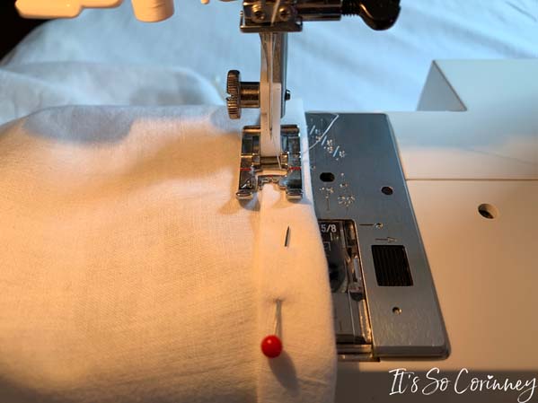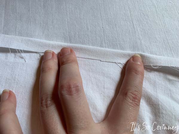 Sew around entire top of skirt 1/4 inch from the top. Make sure that you leave the end threads long because you will need them long so you can pull these to gather the skirt.