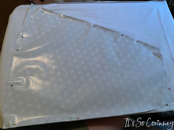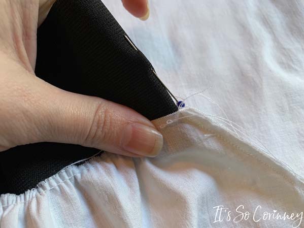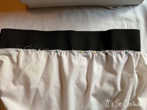 Match the pin on one side of the elastic to the side seam of the skirt. Make sure that the elastic edge is on the outside of your skirt.