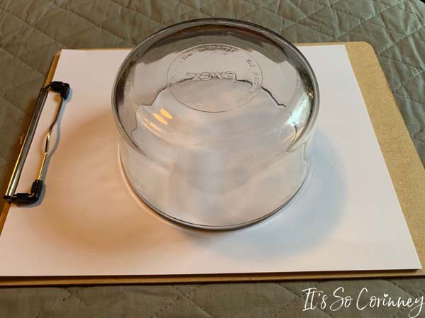 So, on to the button! Firstly, find round objects (like my amazing Pyrex glass bowl) that are 6, 4 1/2, and 3 1/2 inches and trace the them onto regular paper.