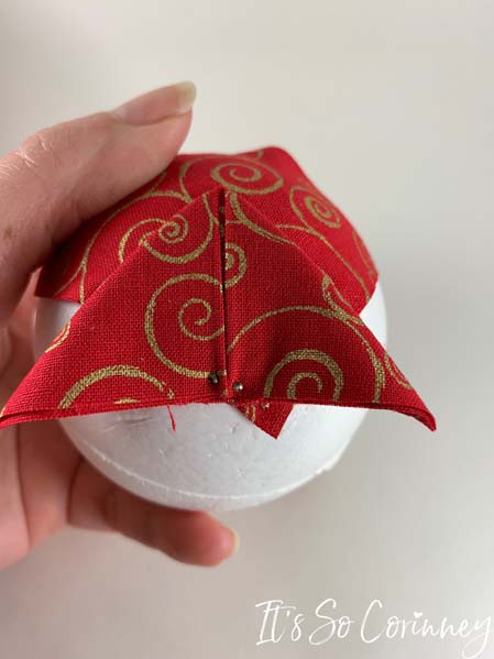 When you get to the top of your quilted Christmas ornament make a 7 1/2 inch loop in your ribbon and use decorative pins to attach to the ball.
