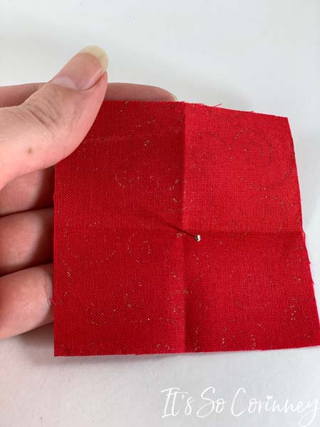 This is what the first square should look like. You don’t have to pin the other two edges of the square yet. When will pin those after all four squares of the first layer are finished. This helps keep the bulk down.