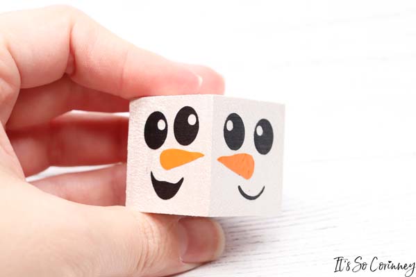 Then turn the wood block to the next side and add the next snowman face. Be careful to not let the other snowmen faces touch your table while you are doing this.