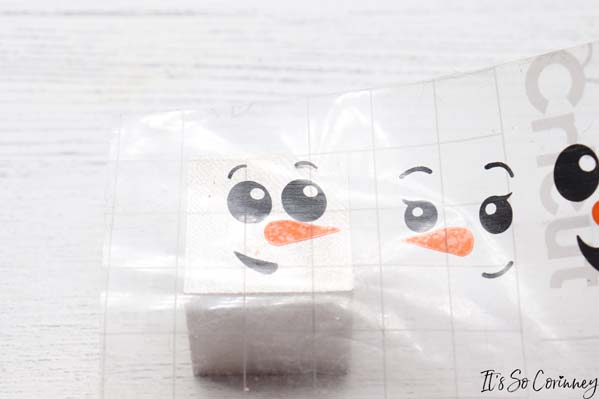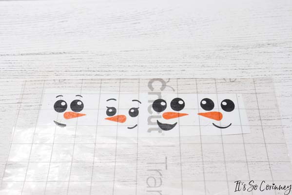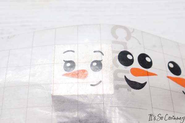 Next, line up the transfer tape and noses on top of the snowmen faces. Once you have them lined up lay the transfer tape down on top of the faces.