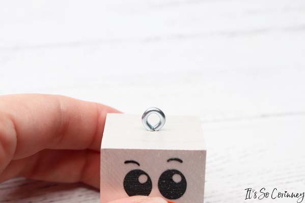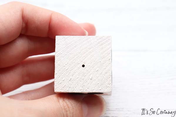 Then you are going to drill a hole in the center of the top side of the block. This is an optional step that you may not need to do. I tried to add the eye hooks to my snowmen wood block ornaments by hand but couldn’t get them to go in. So, if you can get them in by hand then hooray! If not, then use a small drill bit and drill a pilot hole in the wood block.