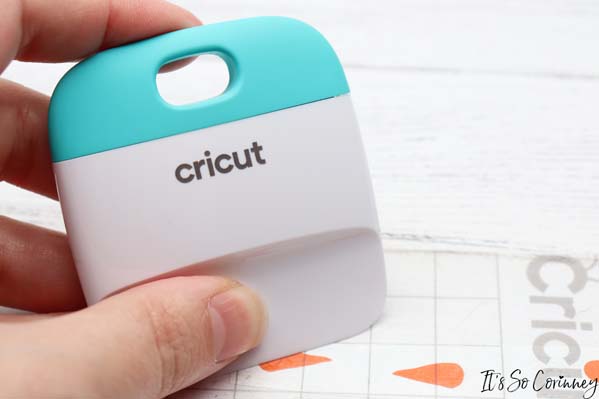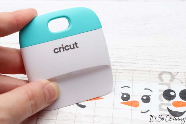 Once you have uploaded your SVG, cut out the vinyl, and weeded lay the transfer tape on top of the orange noses. Then use the Cricut scraper to adhere the transfer tape to the vinyl and remove the vinyl backing from the noses.