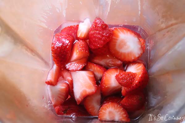 The first step in making these homemade frozen dog treats is to cut off the stems of the strawberries and rinse. Next, blend the strawberries and water until they almost become a puree.