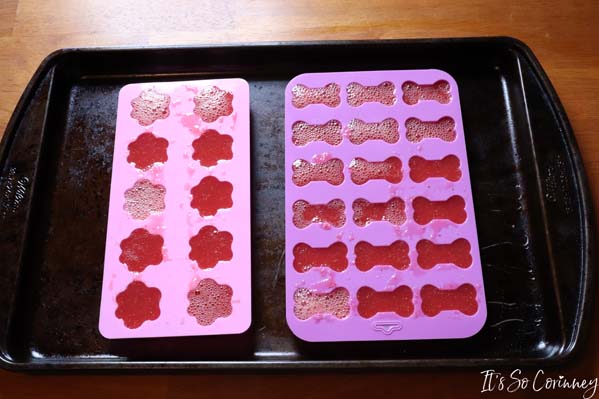Next, fill your silicone molds or ice trays. I put my silicone molds on a sheet pan so it would be easier to carry to the freezer. Obviously, I’m not great at pouring into a mold!
