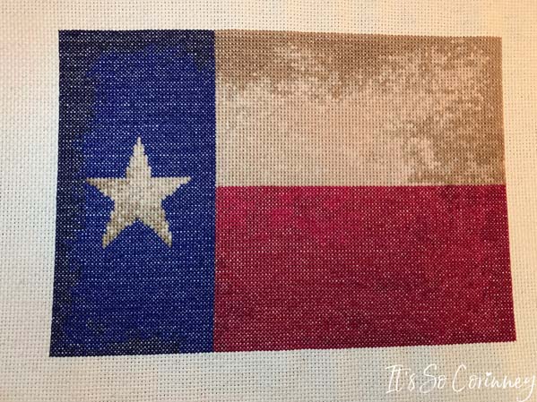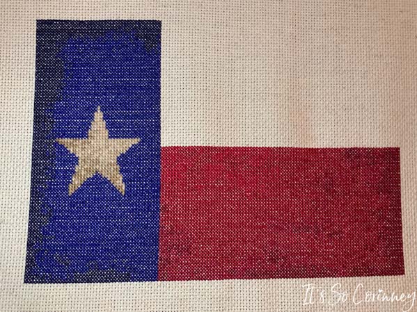 Now, I know that the traditional colors of the Texas flag are red, white, and blue since I have lived in Texas my whole life (lucky me!). However, my mom wanted the flag to look more antiqued so I used several shades of brown for the white portions. You could easily swap out the brown colors for white and gray floss if you would rather go the more traditional route.