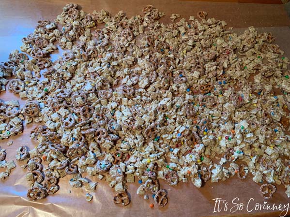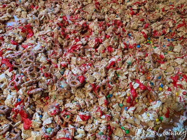 Pour out your Texas trash trail mixture onto the wax paper. Make sure that you don’t have any big mounds of the Texas trash otherwise it will dry in giant clumps.