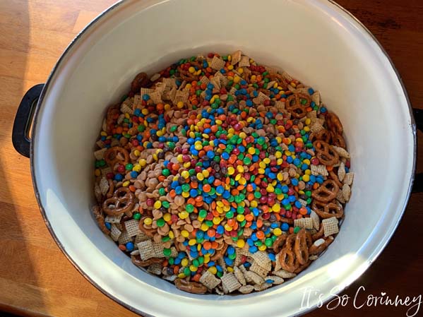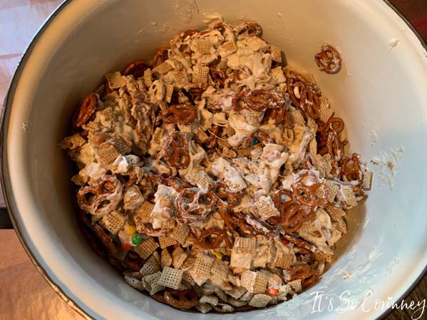- Mix all ingredients except the Wilton candy melts and white morsels in a large pan or bowl. Make sure to not pour the crumbs from the cereal and pretzels into bowl.
