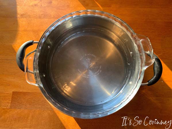 Then, find a bowl, or in my case a pie dish, that fits on top of the pan. Make sure to have NO water in the top bowl or it will make the white morsels wonky when they start melting (I learned this the hard way).