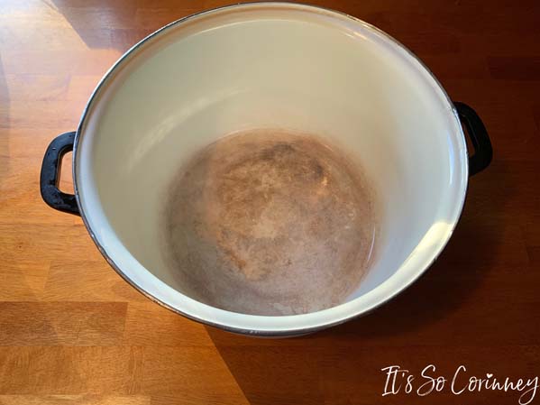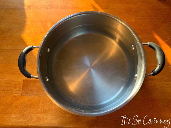 To melt the white morsels you will need a double boiler. Now, I don’t have a double boiler (even though I wish I did!) so don’t fret if you don’t either! Just take your stockpot and put some water on the bottom of it.